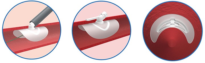 PerQseal is delivered over-the-wire, at the end of the primary procedure, and positioned at the arteriotomy site, using visual and tactile position indicators. Once hemostasis has been confirmed, the wire is removed and the device is deployed.